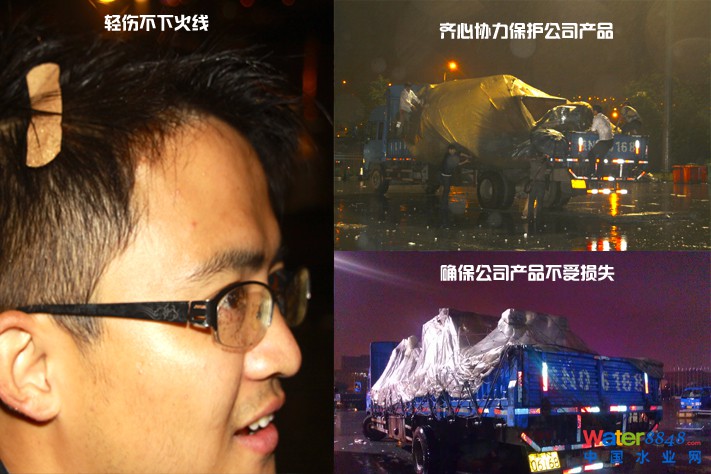 此次展會的最后一天(6月7日),上海大到暴雨,為了盡快將展品撤出展館,我司生產(chǎn)中心同事協(xié)助對展品打好包裝。其中一名同事不小心頭部受傷,只是簡單的用創(chuàng)可貼貼上后又繼續(xù)工作,充分發(fā)揚了輕傷不下火線的精神。展品裝上車后,為防止展品淋濕,我司所有參展人員協(xié)助司機(jī)師傅將展品蓋上防雨布,狂風(fēng)將防雨布吹得到處亂飛,我司人員紛紛爬上車,用身體將防雨布壓好,確保公司展品的安全。