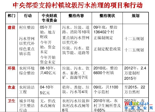 我國農村還處于基本的基礎設施建設階段,尚未到環(huán)境治理的一步,所以垃圾和污水處理在農村建設中最滯后。2005年中央提出新農村建設,開始啟動對農村環(huán)境治理基礎設施的資金補助。新農村建設包括水、路、電、氣、房、環(huán)境等六項工作。水僅指飲用水,污水則包括在環(huán)境之中。今年中央在農村水方面的建設投入是80億元。路即交通,處于非常重要的位置,一般都最先建設,今年中央投資是100億元左右,F在農村道路建設僅到行政村,而非自然村,中西部地區(qū)也還未完全覆蓋到。電的建設達到95%。氣指沼氣,農業(yè)部正在重點推進。房指住房,是住建部的一項大工作,目前占的投資額度最大。農村住房改造,和保障房一樣,由中央和各地政府分擔,今年中央財政拿出了396億元,改造目標是500萬戶。與國家對其他方面如水電、住房等的投入相比,農村環(huán)境建設欠賬太多,各項資金加起來全年僅十幾億,還有很長的路要走。