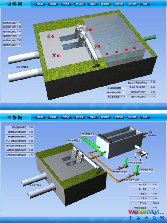 細格柵的間距比粗格柵小,為4mm,主要作用是進一步攔截污水中的污物。需要檢測格柵水位差、流量、泵狀態(tài)等參數(shù)。