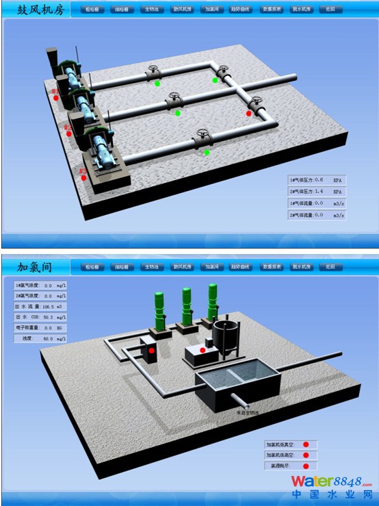 系統(tǒng)以美觀、友好的界面顯示設備運行狀態(tài)、流量、水位、COD超聲波液位計、溶解氧計、氧化還原電位計、污泥濃度計、電磁流量計、等數(shù)據(jù),并以仿真圖、直方圖和曲線圖、棒圖等多種方式清晰直觀的顯示各個敏感數(shù)據(jù),方便用戶對各敏感數(shù)據(jù)進行歷史查詢和對比分析。