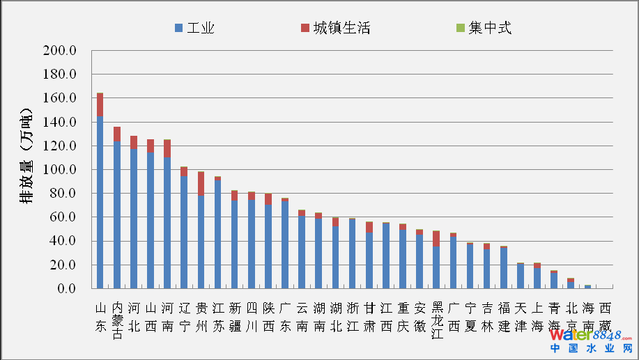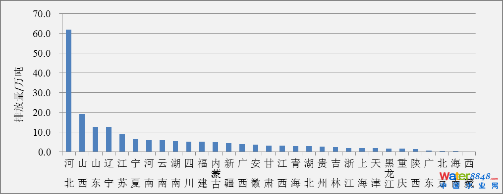 3.3.2 電力、熱力生產(chǎn)和供應(yīng)業(yè)廢氣污染物排放及處理情況 。1)電力、熱力生產(chǎn)和供應(yīng)業(yè)總體情況 2013年,電力、熱力生產(chǎn)和供應(yīng)業(yè)重點(diǎn)調(diào)查工業(yè)企業(yè)5830家,占重點(diǎn)調(diào)查工業(yè)企業(yè)的3.9%;全年工業(yè)廢氣排放量為225446.6億立方米(標(biāo)態(tài)),占重點(diǎn)調(diào)查工業(yè)企業(yè)廢氣排放量的33.7%;二氧化硫排放量為720.6萬(wàn)噸,占重點(diǎn)調(diào)查工業(yè)企業(yè)的42.7%;氮氧化物排放量為896.9萬(wàn)噸,占重點(diǎn)調(diào)查工業(yè)企業(yè)的61.2%;煙(粉)塵排放量為270.3萬(wàn)噸,占重點(diǎn)調(diào)查工業(yè)企業(yè)的26.4%。 電力、熱力生產(chǎn)和供應(yīng)業(yè)擁有廢氣治理設(shè)施23852套,占重點(diǎn)調(diào)查工業(yè)企業(yè)廢氣治理設(shè)施總數(shù)的10.2%。其中,脫硫設(shè)施5916套,占重點(diǎn)調(diào)查工業(yè)企業(yè)脫硫設(shè)施總數(shù)的27.3%;脫硝設(shè)施1168套,占重點(diǎn)調(diào)查工業(yè)企業(yè)脫硝設(shè)施總數(shù)的54.3%;除塵設(shè)施16247套,占重點(diǎn)調(diào)查工業(yè)企業(yè)除塵設(shè)施總數(shù)的9.0%。二氧化硫去除量為2620.1萬(wàn)噸,去除率為78.4%,較重點(diǎn)調(diào)查工業(yè)企業(yè)平均水平(72.2%)高出6.2個(gè)百分點(diǎn);氮氧化物去除量為301.8萬(wàn)噸,去除率為25.2%,較重點(diǎn)調(diào)查工業(yè)企業(yè)平均水平(19.2%)高出6.0個(gè)百分點(diǎn);煙(粉)塵去除量為38238.0萬(wàn)噸,去除率為99.3%,較重點(diǎn)調(diào)查工業(yè)企業(yè)平均水平(98.6%)高出0.7個(gè)百分點(diǎn)。 電力、熱力生產(chǎn)和供應(yīng)業(yè)二氧化硫排放量居全國(guó)前4位的省份依次為內(nèi)蒙古、山東、山西和貴州,其二氧化硫排放量占電力、熱力生產(chǎn)和供應(yīng)業(yè)總排放量的34.2%;氮氧化物排放量居前4位的省份依次為內(nèi)蒙古、山東、河南和江蘇,其氮氧化物排放量占電力、熱力生產(chǎn)和供應(yīng)業(yè)總排放量的30.8%;煙(粉)塵排放量居前4位的省份依次為內(nèi)蒙古、黑龍江、遼寧和山西,其煙(粉)塵排放量占電力、熱力生產(chǎn)和供應(yīng)業(yè)總排放量的39.4%。