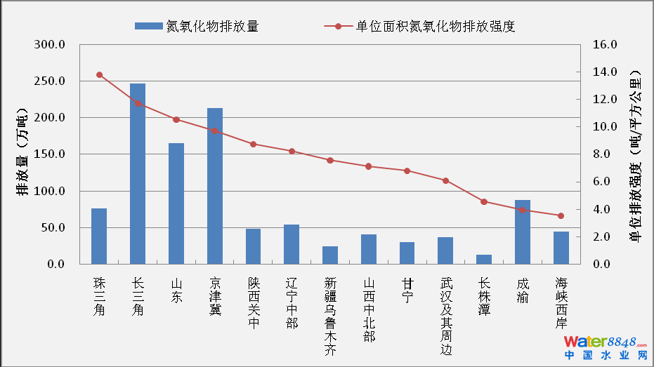 三區(qū)十群共有工業(yè)脫硝設(shè)施1367套,占全國(guó)工業(yè)脫硝設(shè)施數(shù)的63.5%,氮氧化物去除率為21.6%。全年工業(yè)氮氧化物去除量為208.7萬(wàn)噸,占全國(guó)工業(yè)氮氧化物去除量的58.2%。 三區(qū)十群中,氮氧化物排放量居前4位的區(qū)域依次為長(zhǎng)三角地區(qū)、京津冀地區(qū)、山東城市群和成渝城市群,其氮氧化物排放量占三區(qū)十群排放量的66.2%。 三區(qū)十群?jiǎn)挝幻娣e氮氧化物排放強(qiáng)度為8.1噸/平方公里,是全國(guó)平均排放強(qiáng)度(2.3噸/平方公里)的3.5倍。三區(qū)十群中各區(qū)域單位面積氮氧化物排放強(qiáng)度均高于全國(guó)平均水平。其中,單位面積氮氧化物排放強(qiáng)度較大的區(qū)域?yàn)橹槿堑貐^(qū)、長(zhǎng)三角地區(qū)、山東城市群和京津冀地區(qū),其污染物排放強(qiáng)度分別為13.8、11.7、10.5和9.7噸/平方公里。氮氧化物排放量和單位面積氮氧化物排放強(qiáng)度均較大的區(qū)域?yàn)殚L(zhǎng)三角地區(qū)、京津冀地區(qū)和山東城市群。