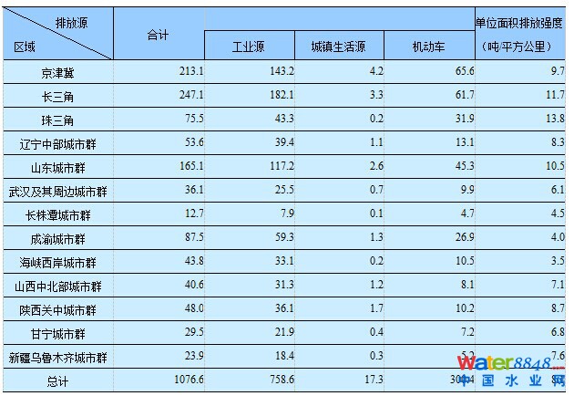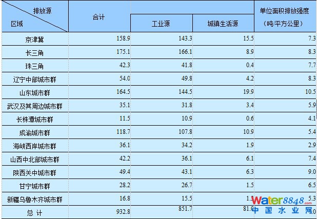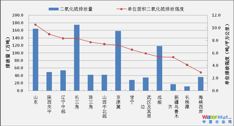 2013年,三區(qū)十群二氧化硫排放量為932.8萬(wàn)噸,其中,工業(yè)二氧化硫排放量為851.7萬(wàn)噸,占三區(qū)十群二氧化硫排放總量的91.3%,城鎮(zhèn)生活二氧化硫排放量為81.0萬(wàn)噸,占三區(qū)十群二氧化硫排放總量的8.7%,集中式二氧化硫排放量為0.1萬(wàn)噸。 三區(qū)十群共有工業(yè)脫硫設(shè)施14185套,占全國(guó)工業(yè)脫硫設(shè)施數(shù)的65.4%,二氧化硫去除率為71.0%。全年工業(yè)二氧化硫去除量為2039.3萬(wàn)噸,占全國(guó)工業(yè)二氧化硫去除量的45.5%。 三區(qū)十群中,二氧化硫排放量居前4位的區(qū)域依次為長(zhǎng)三角地區(qū)、山東城市群、京津冀地區(qū)和成渝城市群,其二氧化硫排放量占三區(qū)十群排放量的66.2%。 三區(qū)十群?jiǎn)挝幻娣e二氧化硫排放強(qiáng)度為7.0噸/平方公里,是全國(guó)平均排放強(qiáng)度(2.1噸/平方公里)的3.3倍。三區(qū)十群中各區(qū)域的單位面積二氧化硫排放強(qiáng)度均高于全國(guó)平均水平。其中,單位面積二氧化硫排放強(qiáng)度較大的區(qū)域?yàn)樯綎|城市群和陜西關(guān)中城市群,其污染物排放強(qiáng)度分別為10.5噸/平方公里和9.0噸/平方公里。二氧化硫排放量和單位面積二氧化硫排放強(qiáng)度均較大的區(qū)域?yàn)殚L(zhǎng)三角地區(qū)、山東城市群和京津冀地區(qū)。