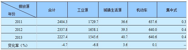 注:集中式污染治理設(shè)施包括生活垃圾處理廠(場(chǎng))和危險(xiǎn)廢物(醫(yī)療廢物)集中處理(置)廠焚燒廢氣中排放的污染物。(下同) 3.1.2 氮氧化物排放情況 2013年,全國(guó)氮氧化物排放量2227.4萬(wàn)噸,比上年減少4.7%。 工業(yè)氮氧化物排放量1545.6萬(wàn)噸,比上年減少6.8%,占全國(guó)氮氧化物排放總量的69.4%。 城鎮(zhèn)生活氮氧化物排放量40.7萬(wàn)噸,比上年增加3.6%,占全國(guó)氮氧化物排放總量的1.8%。 機(jī)動(dòng)車(chē)氮氧化物排放量640.6萬(wàn)噸,比上年增加0.1%,占全國(guó)氮氧化物排放總量的28.8%。 集中式污染治理設(shè)施氮氧化物排放量0.4萬(wàn)噸。 表3-2 全國(guó)氮氧化物排放量 單位:萬(wàn)噸