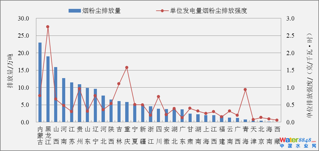 圖3-6 各地區(qū)電力、熱力生產(chǎn)和供應(yīng)業(yè)煙(粉)塵排放情況 。2)火電廠廢氣污染物排放及治理情況 2013年,納入重點(diǎn)調(diào)查統(tǒng)計(jì)范圍的火電廠共3102家,占重點(diǎn)調(diào)查工業(yè)企業(yè)數(shù)量的2.1%。其中,獨(dú)立火電廠1853家,擁有4825臺(tái)機(jī)組,共有脫硫設(shè)施3547套,脫硝設(shè)施1076套,除塵設(shè)施5140套;自備電廠1249家,擁有2690臺(tái)機(jī)組,其中1106臺(tái)機(jī)組有脫硫設(shè)施,162臺(tái)有脫硝設(shè)施,1569臺(tái)有除塵設(shè)施。 獨(dú)立火電廠二氧化硫排放量為634.1萬(wàn)噸,比上年減少10.2%,占重點(diǎn)調(diào)查工業(yè)企業(yè)排放量的37.5%,占電力、熱力生產(chǎn)和供應(yīng)業(yè)排放量的88.0%;共去除二氧化硫2584.7萬(wàn)噸,二氧化硫去除率達(dá)80.3%,比上年提高3.1個(gè)百分點(diǎn),比重點(diǎn)調(diào)查工業(yè)企業(yè)平均水平高8.1個(gè)百分點(diǎn)。 獨(dú)立火電廠二氧化硫排放量居前4位的省份依次為山東、內(nèi)蒙古、山西和貴州,其二氧化硫排放量占全國(guó)獨(dú)立火電廠排放量的35.5%。獨(dú)立火電廠單位發(fā)電量二氧化硫平均排放強(qiáng)度為1.63克/千瓦時(shí),比上年減少14.2%,其中重慶、四川和貴州3個(gè)省份的排放強(qiáng)度大于4.0克/千瓦時(shí)。
