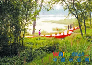 東岸:因為駁岸較緩,主要采用植物護岸,栽植一定量的蘆葦、香蒲等挺水植物,既能消除游船所形成的波浪對駁岸產(chǎn)生的不良影響,也起到了穩(wěn)定岸線的功能。