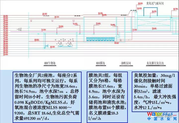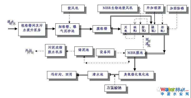 按照對(duì)各種主要出水指標(biāo)的工藝方案的分析,結(jié)合實(shí)際工程的特點(diǎn),按照現(xiàn)在社會(huì)影響普遍能夠接受的方式,設(shè)計(jì)了地下處理廠,采用MBR工藝,此工藝是多級(jí)AO+MBR+臭氧+高級(jí)氧化工藝流程。