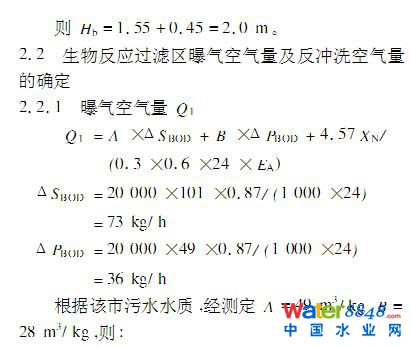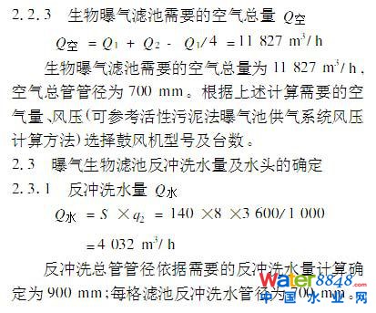 (2)曝氣生物濾池處理城市污水的主要設(shè)計參數(shù)為:有機物容積負(fù)荷210~313kgBOD/(m3・d);過濾濾速018~115m/h;水力停留時間110~210h;生化反應(yīng)曝氣量氣水比為6~9;反沖洗方式中空氣單獨沖洗3~5min,氣水聯(lián)合反沖洗3~5min,水單獨沖洗1~3min;空氣反沖洗強度10~20L/(s・m2),水反沖洗強度510~1010L/(s・m2)。
