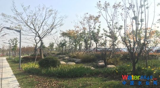 通過建設(shè)生態(tài)護(hù)岸、路面透水鋪裝、建設(shè)雨水花園及雨水分散-滲透系統(tǒng),實(shí)現(xiàn)了存儲(chǔ)、滲透、凈化的海綿功能,營(yíng)造出兩岸自然水生態(tài)美景。綠地內(nèi)海綿功能實(shí)現(xiàn)了對(duì)徑流雨水的有效消納。