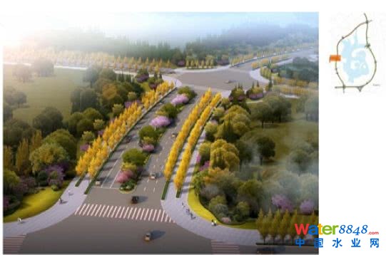 龍耀路以北景觀設(shè)計(jì)主要以樹林、草坪、廣場(chǎng)、花園相結(jié)合,使“水系和綠地穿插,汽車、自行車、人與河流并行不悖”。