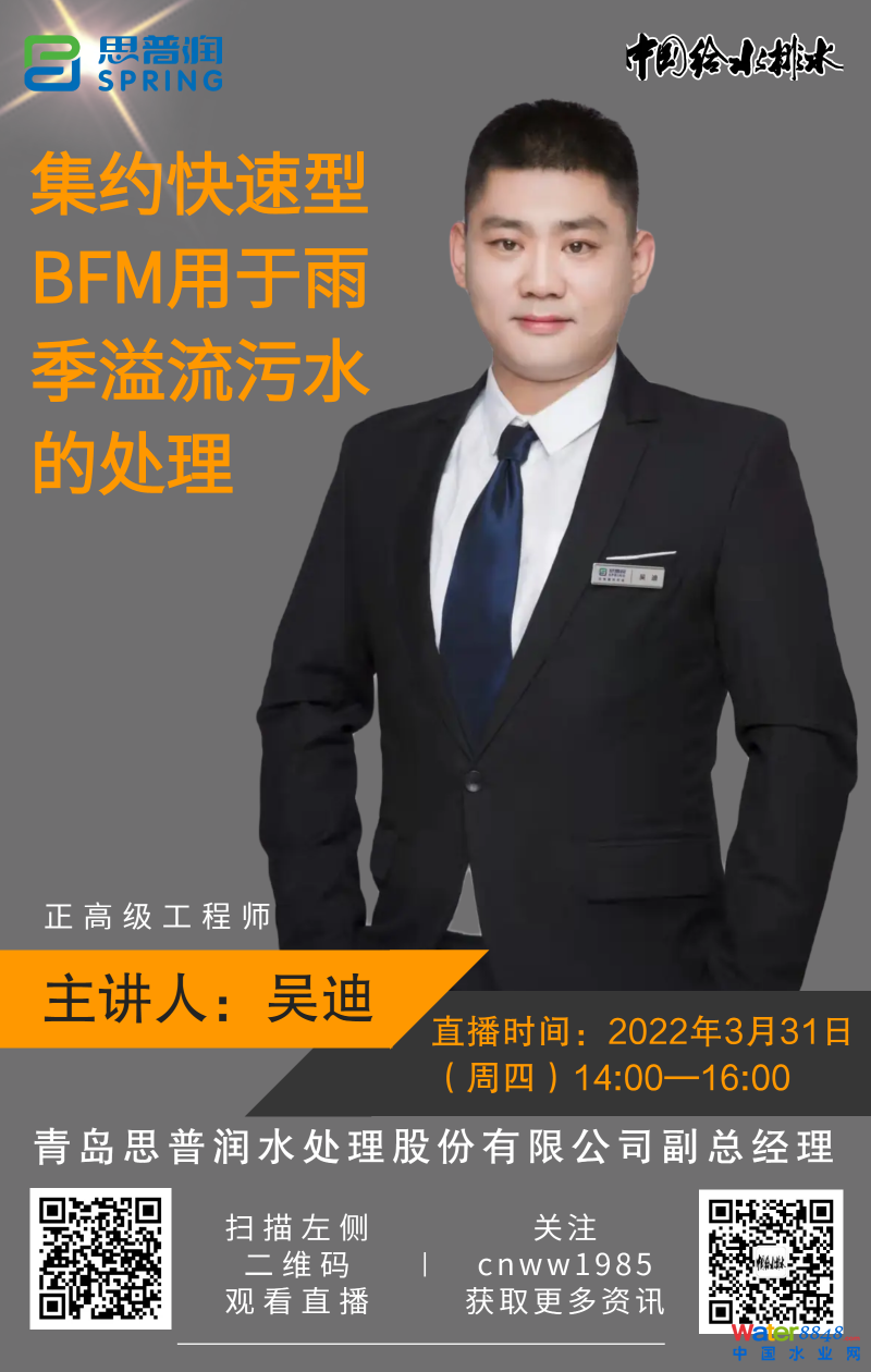 中國(guó)給水排水直播:報(bào)告題目:集約快速型BFM用于雨季溢流污水的處理 報(bào)告人:青島思普潤(rùn)水處理股份有限公司 副總經(jīng)理 吳迪 博士 ,男,正高級(jí)工程師,青島市高層次人才、享受市政府特殊津