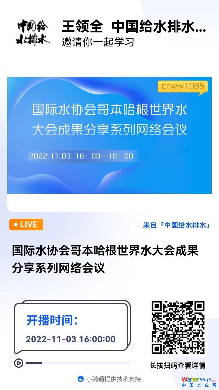 國際水協(xié)會哥本哈根世界水大會成果分享系列網絡會議(第六期)   直播時間:2022年11月22日 20:00—22:00 會議預告| 國際水協(xié)會哥本哈根世界水大會成果分享系列網絡會議(第五期) 中國給水排水