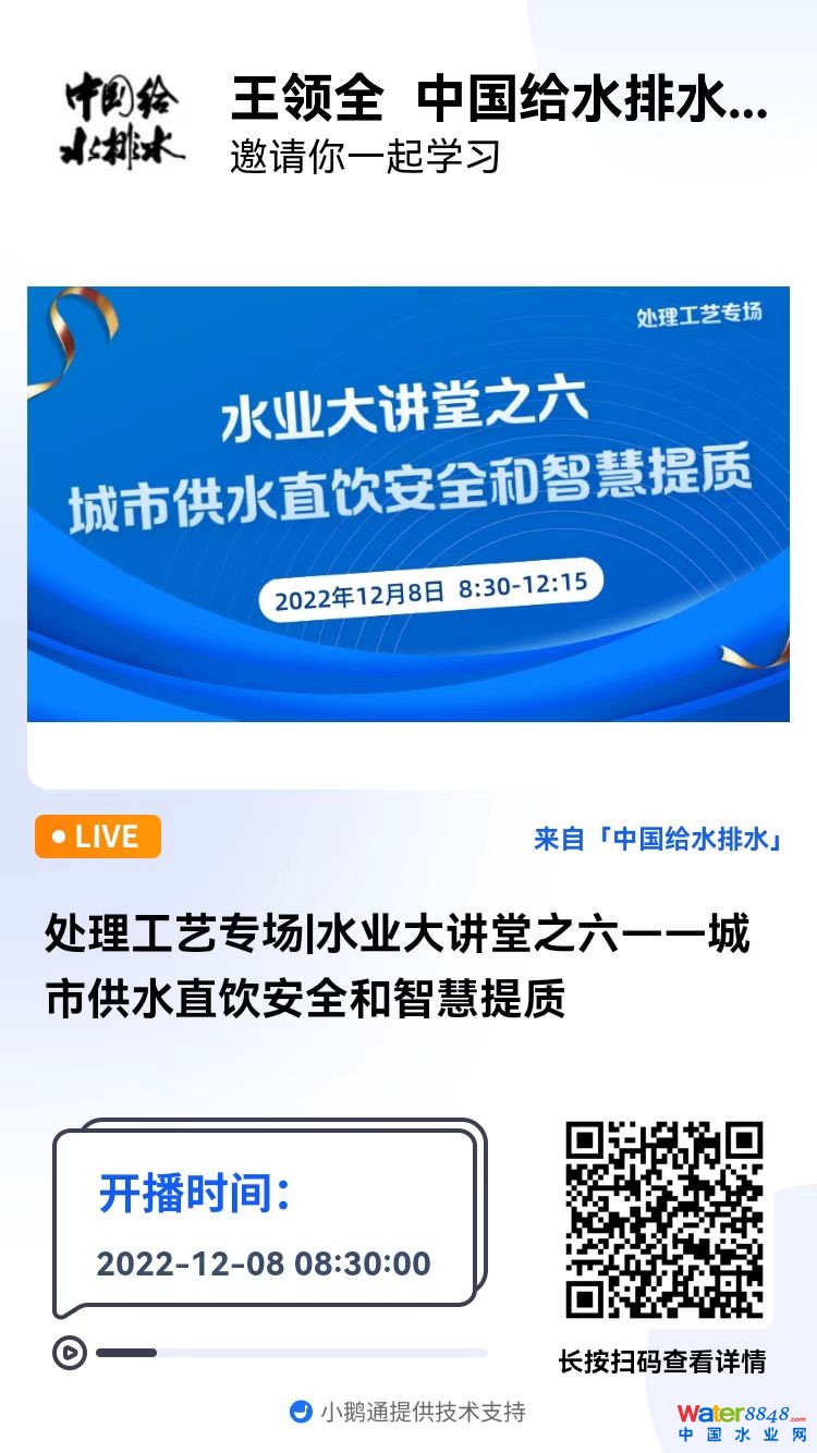 處理工藝專場|水業(yè)大講堂之六——城市供水直飲安全和智慧提質(zhì) 直播時(shí)間:2022年12月8日 8:30—12:15