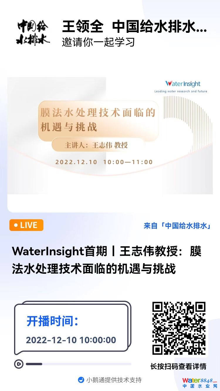 WaterInsight首期丨王志偉教授:膜法水處理技術(shù)面臨的機(jī)遇與挑戰(zhàn) 直播時間:2022年12月10日 10:00—11:00