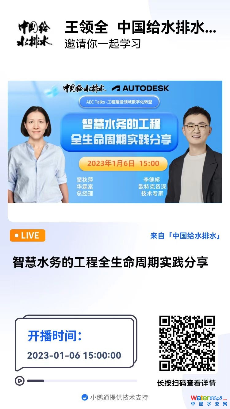 智慧水務(wù)的工程全生命周期實(shí)踐分享     直播時(shí)間:2023年1月6日 15:00-16:00
