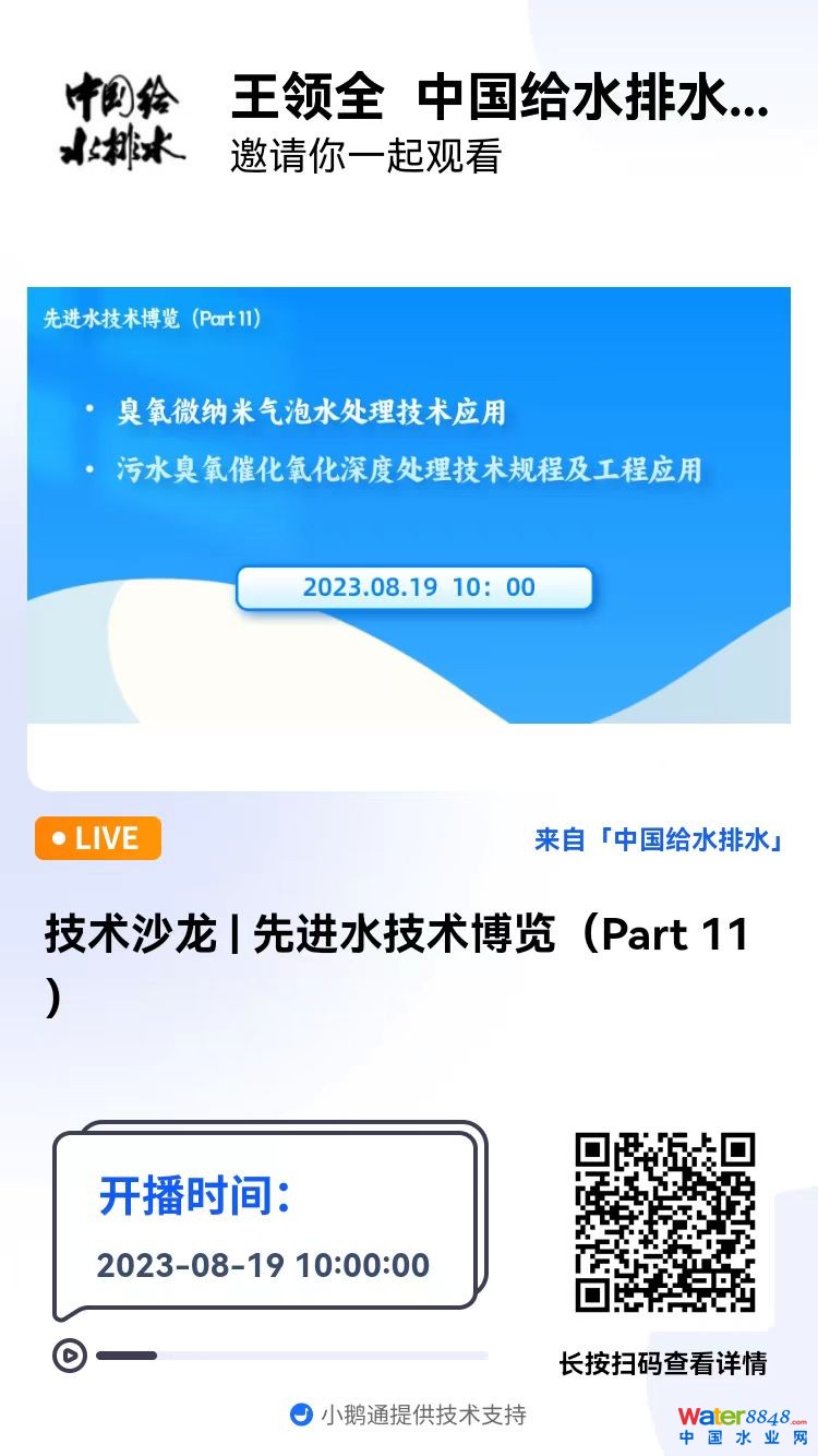 技術(shù)沙龍 | 先進(jìn)水技術(shù)博覽(Part 11) 直播時(shí)間:8月19日(周六)上午10:00-12:00 2023-08-19 10:00:00  廣東匯祥環(huán)境科技有限公司  湛蛟  技術(shù)總監(jiān)  天津萬(wàn) 中國(guó)水業(yè)院士論壇-中國(guó)給水排水直播平臺(tái)(微信公眾號(hào)cnww1985):自然—社會(huì)水循環(huán)與水安全學(xué)術(shù)研討會(huì)