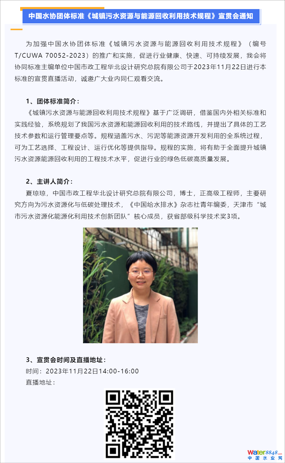 為加強(qiáng)中國(guó)水協(xié)團(tuán)體標(biāo)準(zhǔn)《城鎮(zhèn)污水資源與能源回收利用技術(shù)規(guī)程》(編號(hào)T/CUWA 70052-2023)的推廣和實(shí)施,促進(jìn)行業(yè)健康、快速、可持續(xù)發(fā)展,我會(huì)將協(xié)同標(biāo)準(zhǔn)主編單位中國(guó)市政工程華北設(shè)計(jì)研究總院有限公司于20231122日進(jìn)行本標(biāo)準(zhǔn)的宣貫直播活動(dòng),誠(chéng)邀廣大業(yè)內(nèi)同仁觀看交流。
