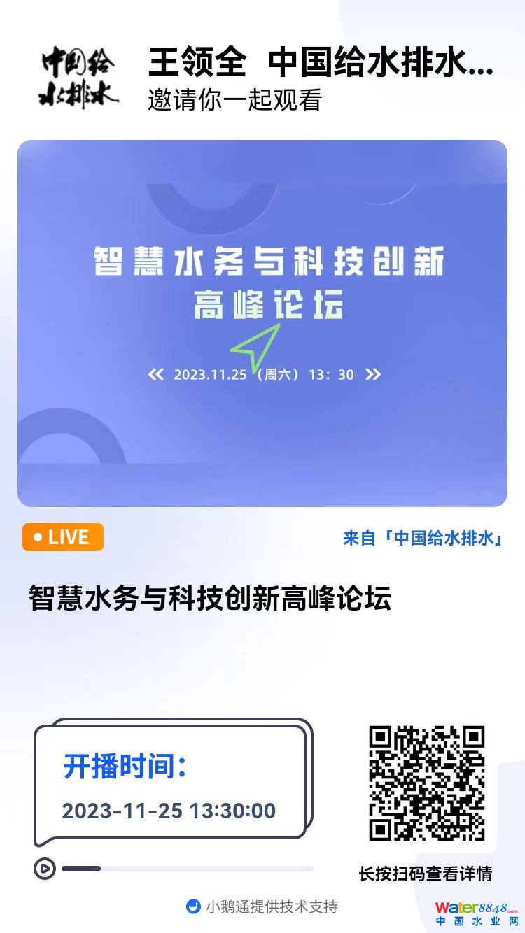 核心提示:智慧水務(wù)與科技創(chuàng)新高峰論壇 直播時間:2023年11月25日(周六) 13:30 2023-11-25 13:30:00 開始