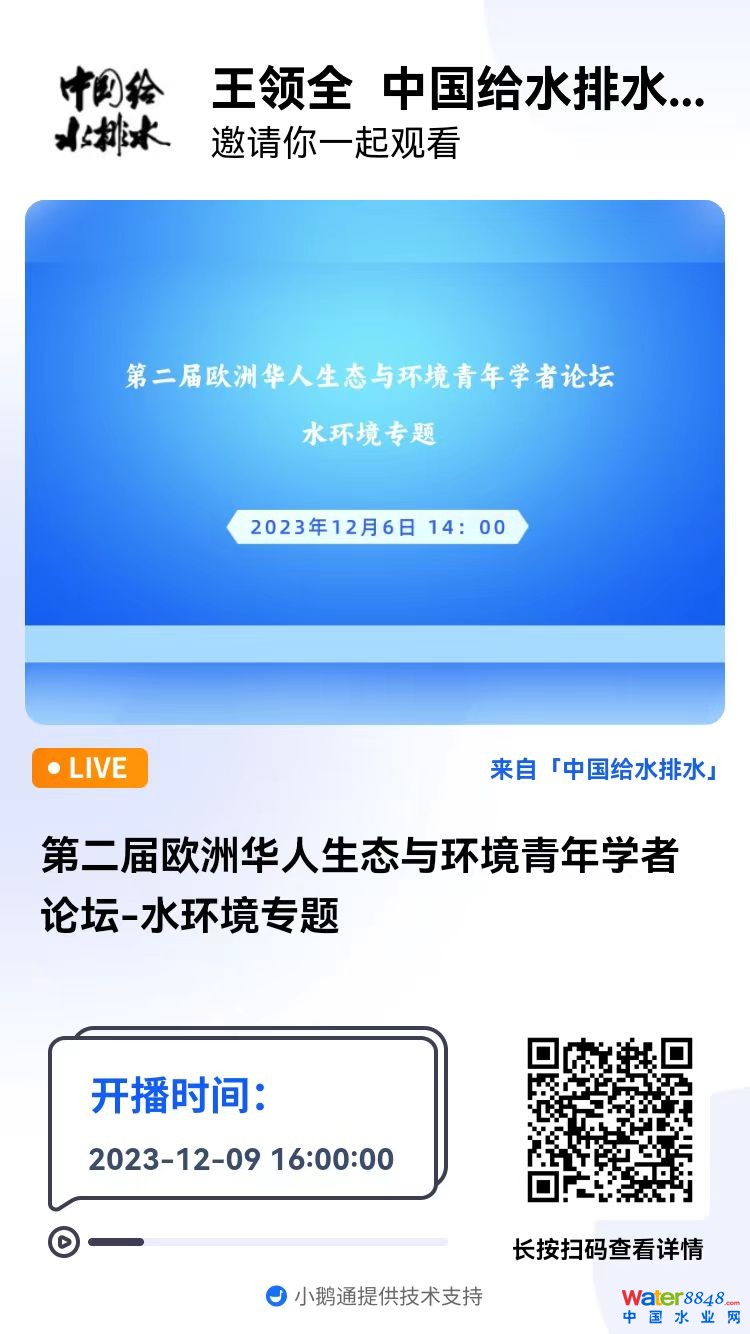 中國(guó)城鎮(zhèn)供水排水協(xié)會(huì)城鎮(zhèn)水環(huán)境專(zhuān)業(yè)委員會(huì)2023年年會(huì)暨換屆大會(huì) 直播時(shí)間:2023年12月16日(周六)08:30—18:00 2023-12-16 08:30:00 開(kāi)始 第二屆歐洲華人生態(tài)與環(huán)境青年學(xué)者論壇-水環(huán)境專(zhuān)題 直播時(shí)間:2023年12月9日(周六)16:00—24:00 2023-12-09 16:00:00 開(kāi)始