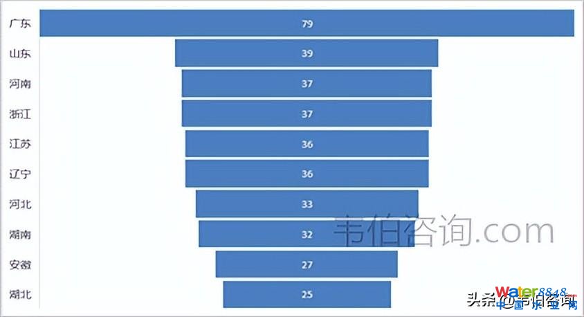 從擁有設(shè)計處理能力為10萬噸/日的污水處理廠數(shù)量來看:廣東省以79座的規(guī)模位遙遙領(lǐng)先;位列第二的山東省僅為廣東省的一半,河南省和浙江省以37座的數(shù)量位列第三,江蘇省和遼寧省以36座的數(shù)量位列第五位。