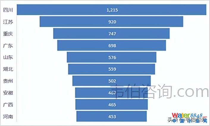 從污水處理廠絕對數(shù)量來看:四川省位列全國第一,達1215座;江蘇和重慶緊隨其后,廣東和山東排名第四、五位。