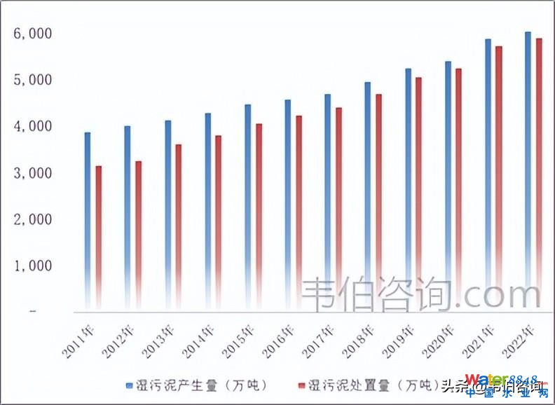2022年,全國城市及縣城污水廠產(chǎn)生的污泥量已突破6,000萬噸(以含水率80%計),繼續(xù)保持逐年增長的趨勢。