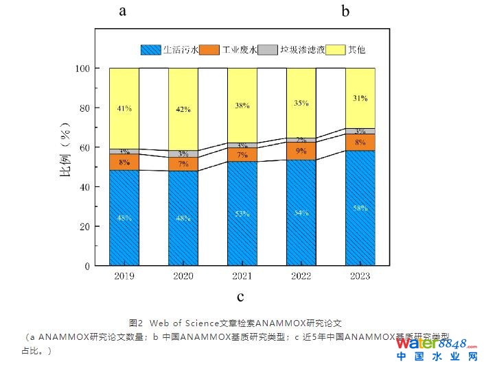 如果以進水基質(zhì)類型分類,國內(nèi)以生活污水為基質(zhì)的論文1 903篇(61%),遠高于工業(yè)廢水和滲濾液(12%)(圖2b)。進一步追蹤近5年ANAMMOX基質(zhì)研究類型占比變化,國內(nèi)以生活污水為基質(zhì)的論文從2019年的150篇(48%)逐年上升至2023年的262篇(58%)。這說明目前我國對ANAMMOX的研究確實已不滿足止步于高氨氮濃度廢水,有將其拓展為大眾技術(shù)的企圖。