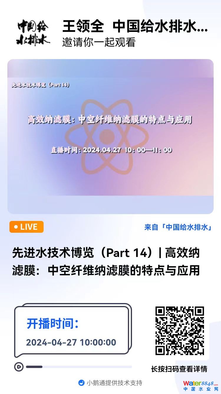高效納濾膜:中空纖維納濾膜的特點(diǎn)與應(yīng)用 直播時(shí)間:2024年4月27日(周六)10:00-11:00 2024-04-27 10:00:00 開始-先進(jìn)水技術(shù)博覽(Part 14)