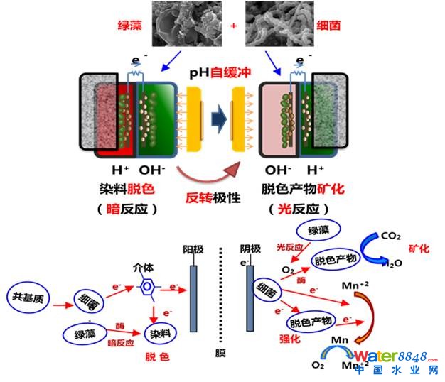 [2]構建新型連續(xù)反轉極性運行的藻菌生物電化學系統(tǒng),實現(xiàn)陰、陽極pH動態(tài)自緩沖、單電極礦化偶氮染料和同步產(chǎn)電。解決了生物電化學法降解偶氮染料和產(chǎn)電過程中偶氮染料及其降解產(chǎn)物對產(chǎn)電菌活性的抑制、偶氮染料脫色液礦化率不高、陰極負載金屬催化劑、需曝氣和使用緩沖液導致的二次污染和成本問題。實際應用中,以易降解有機廢水為共基質,可實現(xiàn)易降解有機廢水和偶氮染料廢水同時處理,以廢治廢,并同步產(chǎn)電。