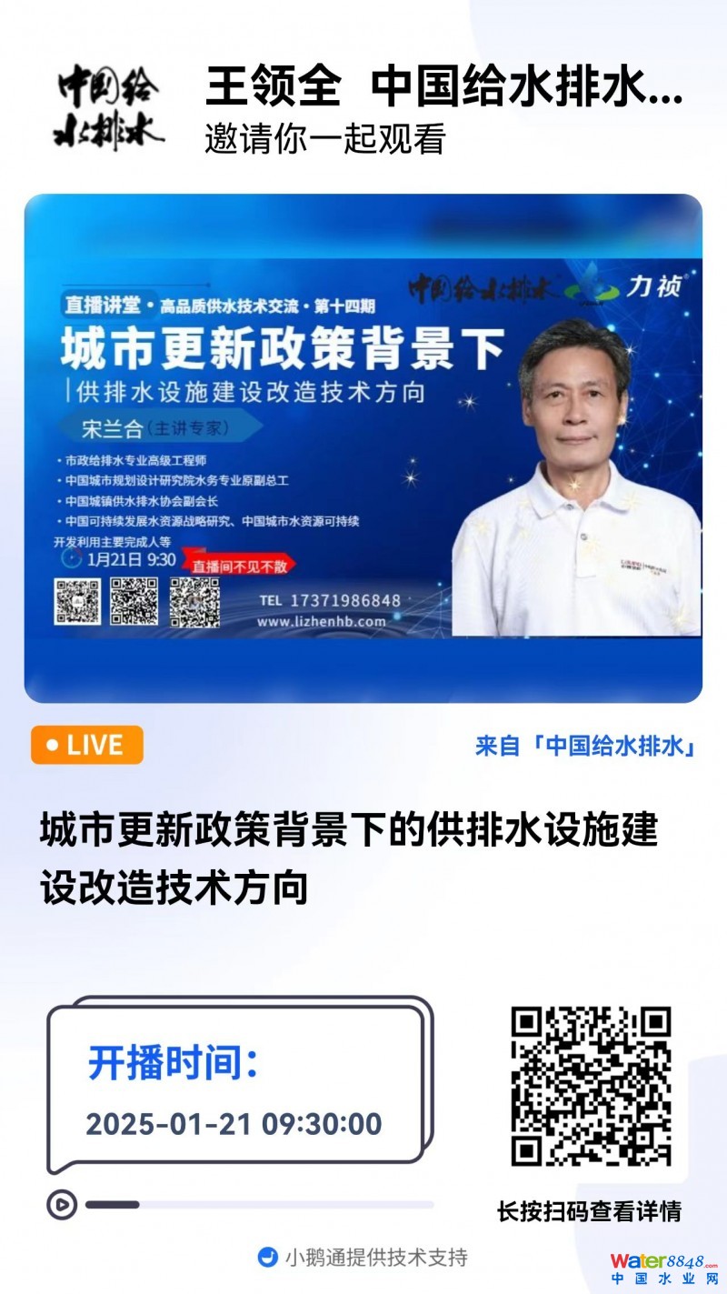 WaterInsight第14期丨水中新污染物高級(jí)氧化降解機(jī)制探索 直播時(shí)間:2025年1月25日(周六)10:00-11:00 2025-01-25 10:00:00 開始 直播報(bào)告題目:城市更新政策背景下的供排水設(shè)施建設(shè)改造技術(shù)方向 1、城市更新由來 2、城市更新政策導(dǎo)向 3、供排水設(shè)施建設(shè)改造技術(shù)方向 3.1供水條例與排水條例要求 3.2供排水管網(wǎng)建設(shè)改造技術(shù)路徑 3