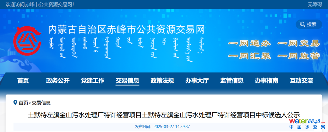 近日,中國水網(wǎng)從E20環(huán)境平臺標訊采集系統(tǒng)E標通獲悉,土默特左旗金山污水處理廠特許經(jīng)營項目發(fā)布中標候選人公示,碧水源為第一候選人,投標報價為203132000.00元。
