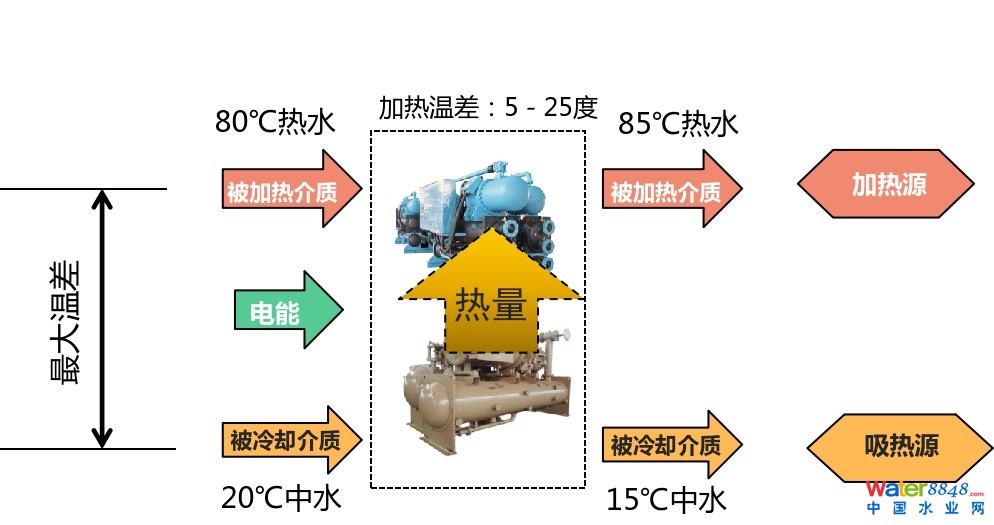 水源熱泵是一種以中水為低溫熱源,借助壓縮機及其中制冷劑(冷媒)的相變,通過消耗少量電能,實現(xiàn)對外供熱的成套設(shè)備,主要由壓縮機、蒸發(fā)器、冷凝器、節(jié)流裝置等部件組成。