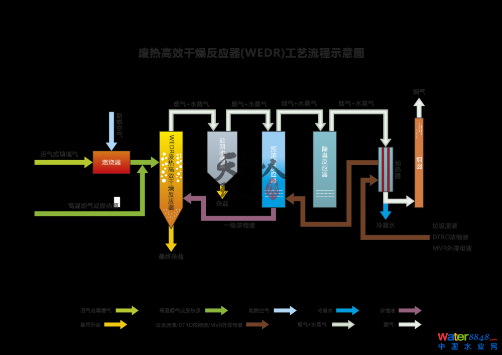 簡(jiǎn)稱WEDR技術(shù),是一種可利用高溫?zé)煔、沼氣、天然氣等清潔能源的干燥技術(shù)。具有適用性強(qiáng)、產(chǎn)生殘?jiān)、占地面積省、運(yùn)行成本低、系統(tǒng)運(yùn)營(yíng)穩(wěn)等特點(diǎn),可專門用于滲濾液全量化處理、濃縮液全量化處理、MVR母液處理、高鹽廢水全量化處理。